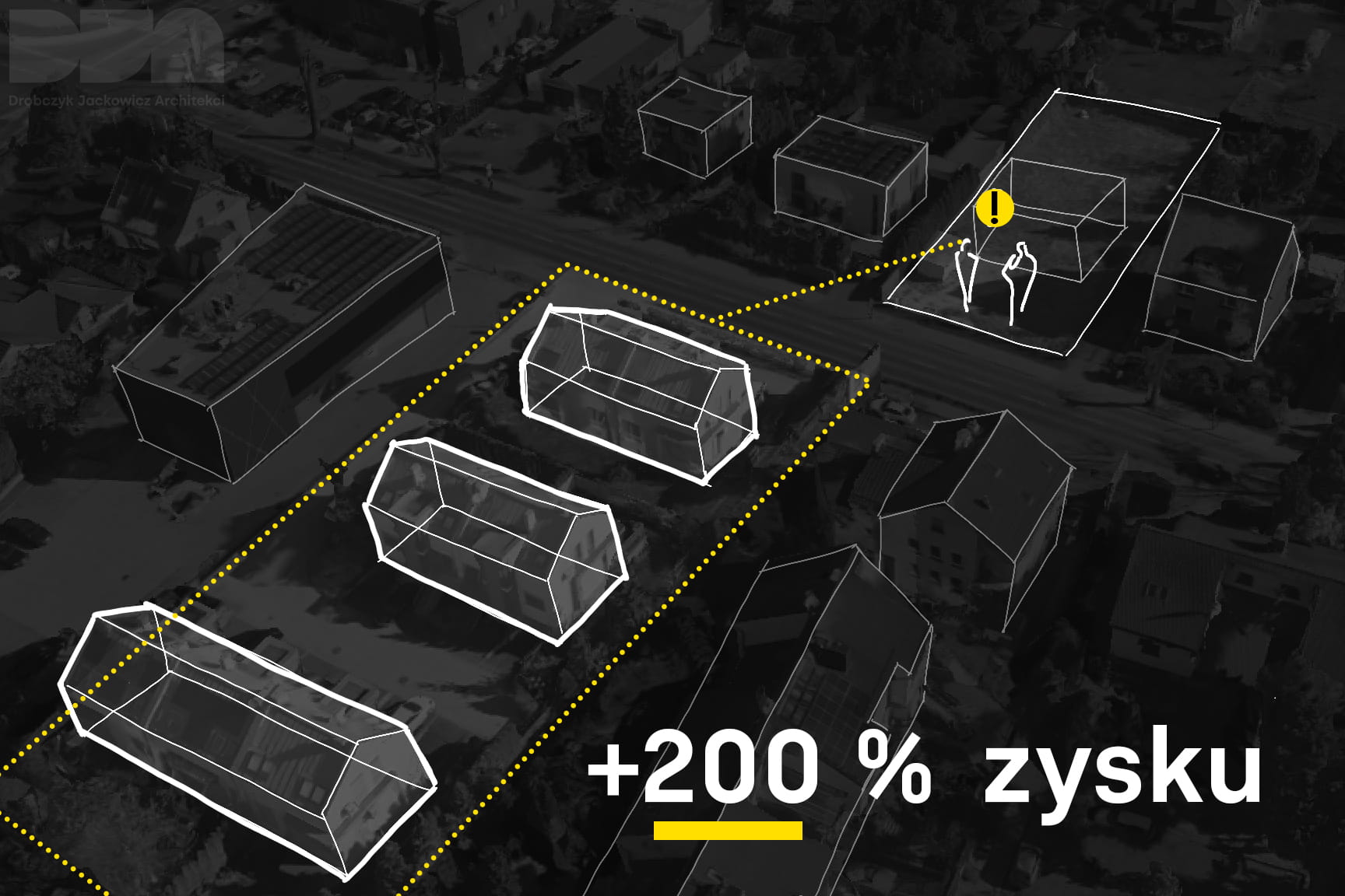 Gdy skala terenu zaczęła pozwalać na bardziej ambitną inwestycję, zaproponowaliśmy zmianę kierunku – zamiast domków, osiedle wielorodzinne. Miejscowy plan zagospodarowania przestrzennego to umożliwiał, jednak inwestycję blokowała jedna, strategiczna działka (600 m²) należąca do innego właściciela.